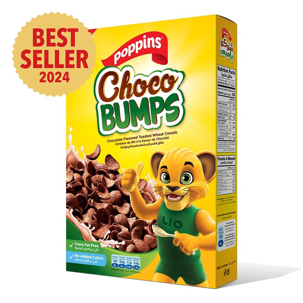 Chocolatey Bumps for Fun Mornings! Poppins Choco Bumps are the perfect way to add excitement to your kids' breakfast. Crunchy and chocolate-flavored, these toasted cereal shells are a good source of fiber and vitamins with no added colors and trans fat-free.