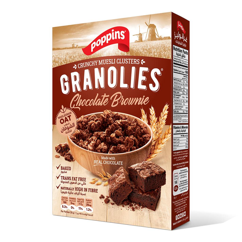 Crunchy Oats & Rich Chocolate! Our Poppins Chocolate Brownie Granolies are made with wholegrain oats and other wholesome ingredients. They're baked to perfection, trans-fat-free, and naturally high in fiber, making them a great healthy snack. Whether you enjoy your granola with milk, yogurt, or fruit, Poppins Granolies are the perfect way to start your day off right or to have as a mid-day snack.